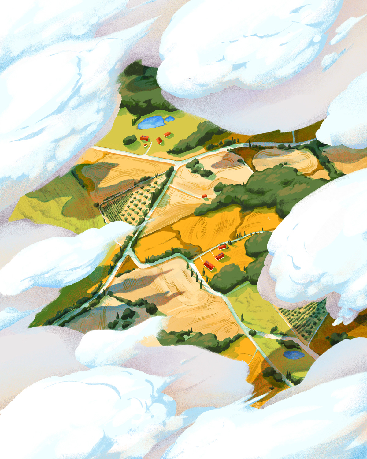 I did this piece to practice illustrating a sense of space and breathing. This angle clicked during a flight over rolling french farmland, and came together after marinating in my head for a month.